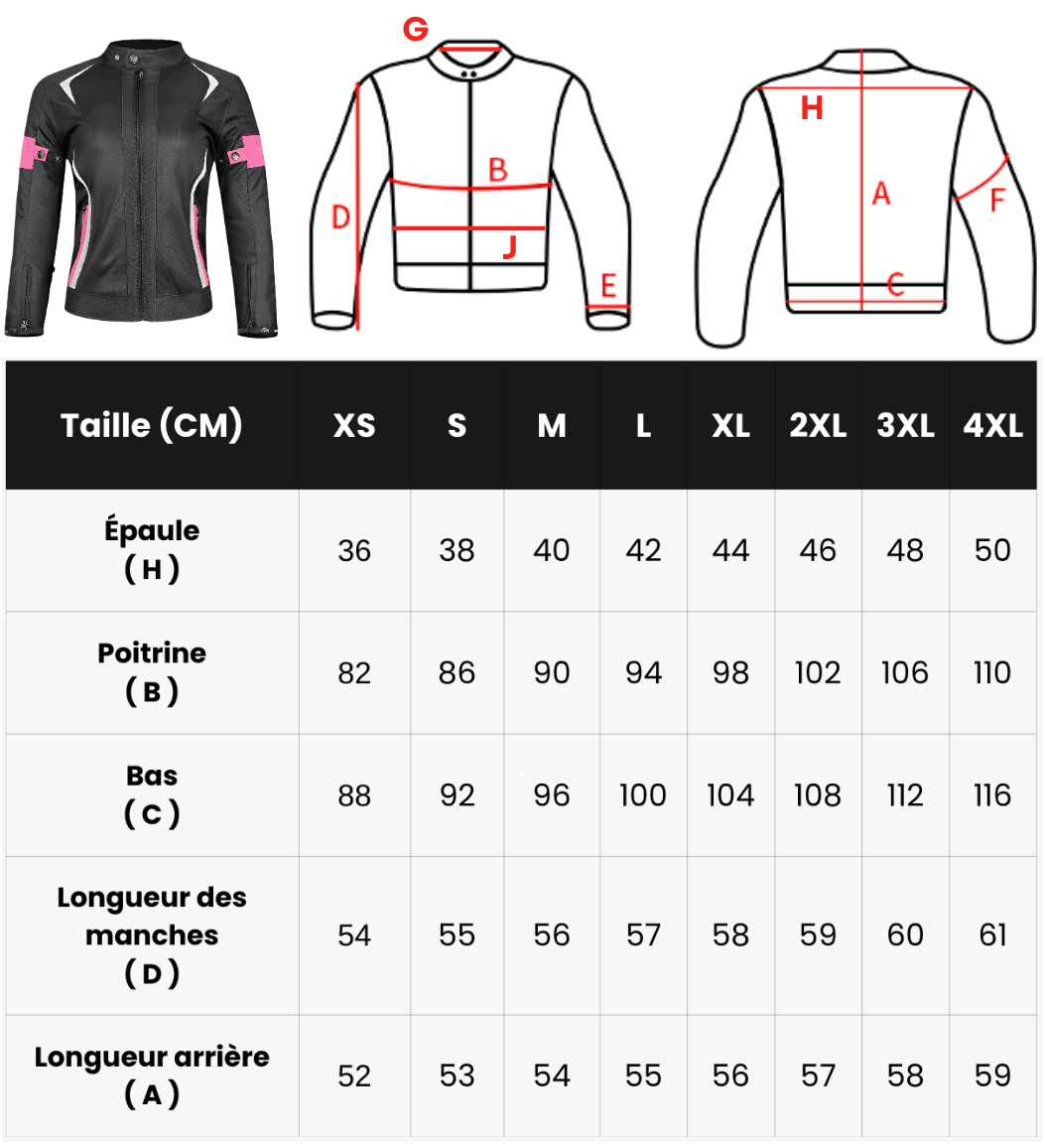 - Conseil : Si vos mesures se situent entre deux tailles, choisissez toujours la taille supérieure.