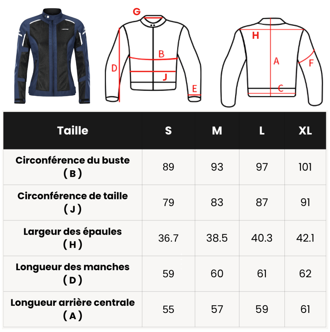 - Conseil : Si vos mesures se situent entre deux tailles, choisissez toujours la taille supérieure.