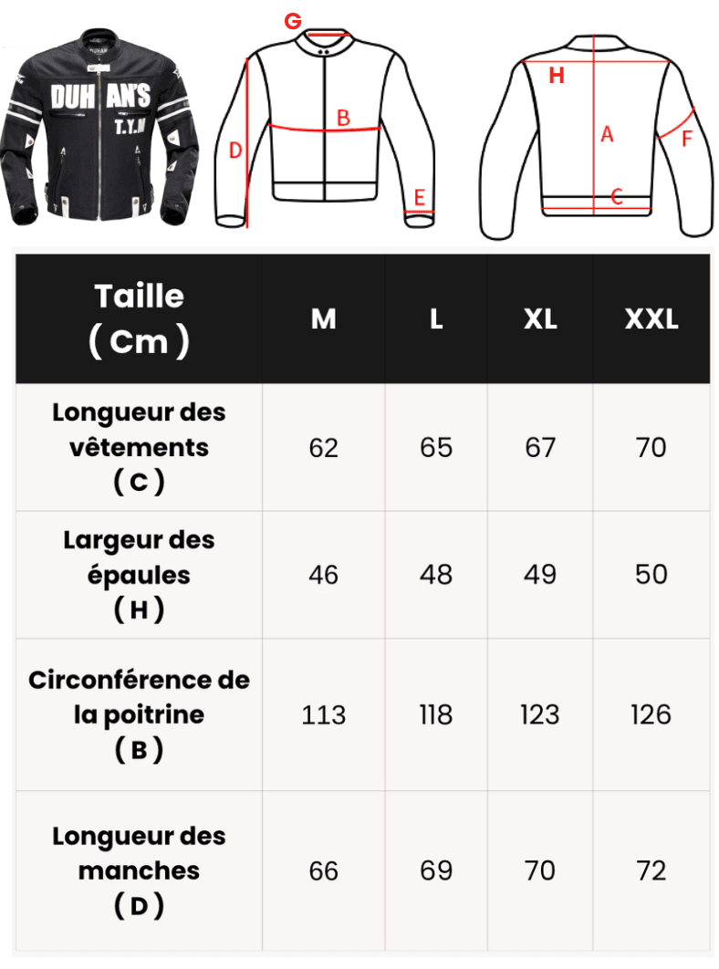- Conseil : Si vos mesures se situent entre deux tailles, choisissez toujours la taille supérieure.