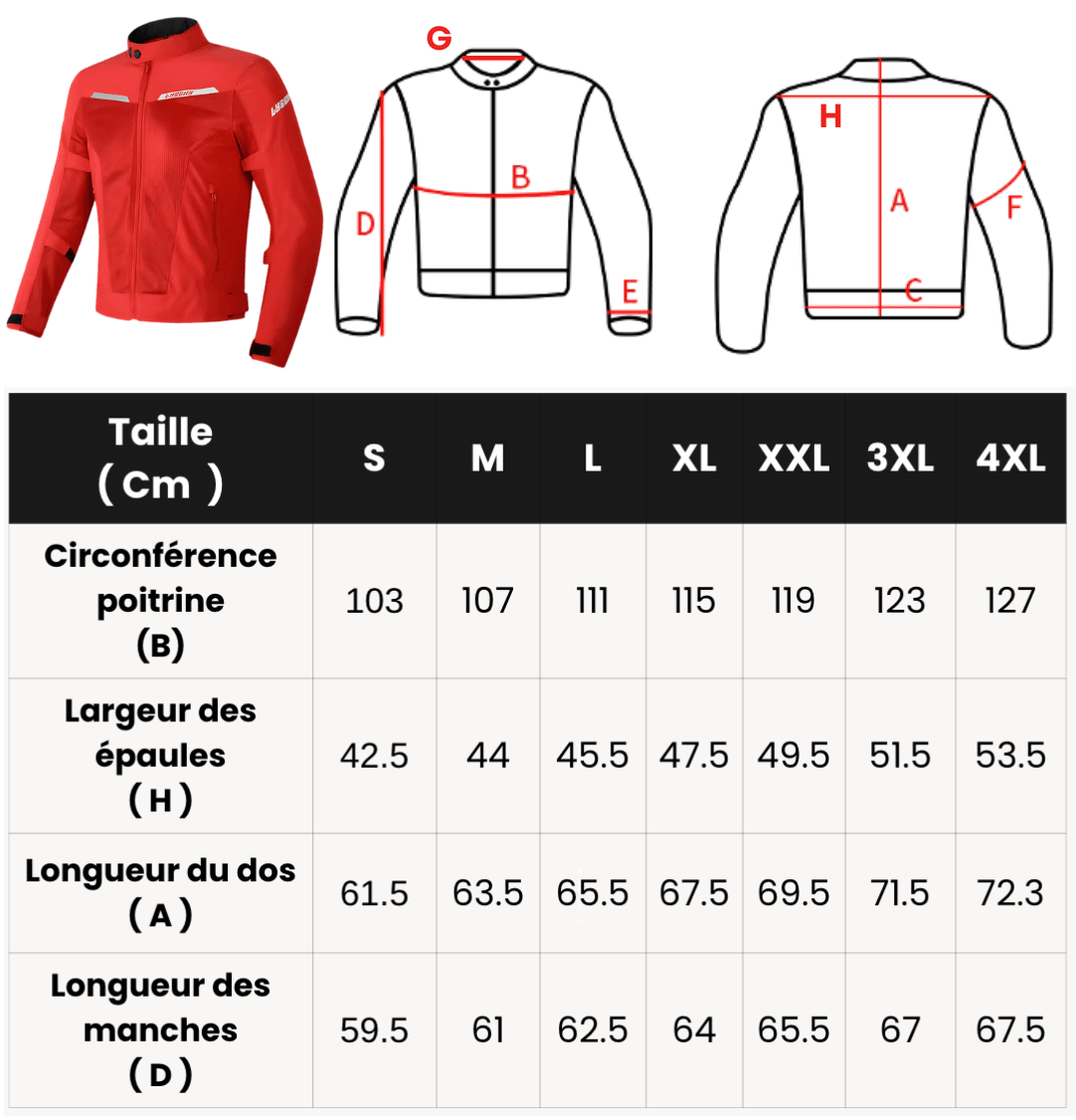 - Conseil : Si vos mesures se situent entre deux tailles, choisissez toujours la taille supérieure.