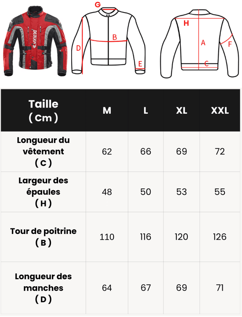 • Tailles : M, L, XL, XXL, veuillez choisir la taille selon le tableau des tailles.