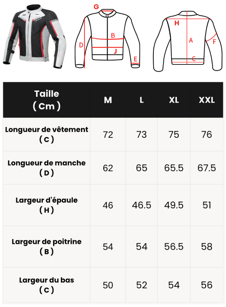 - Conseil : Si vos mesures se situent entre deux tailles, choisissez toujours la taille supérieure.