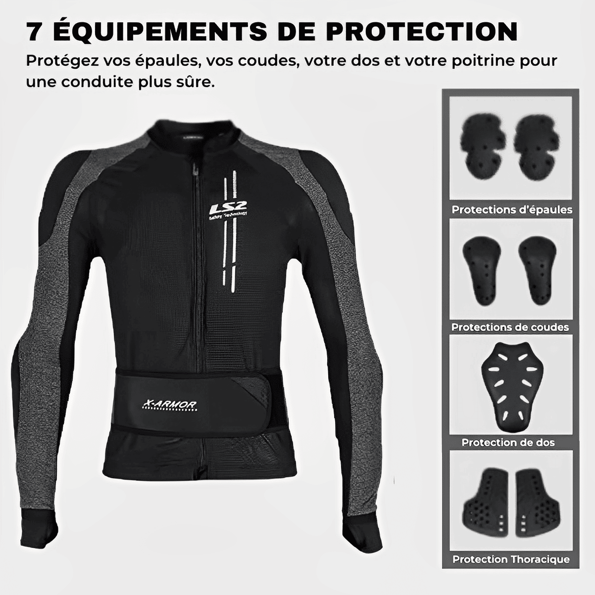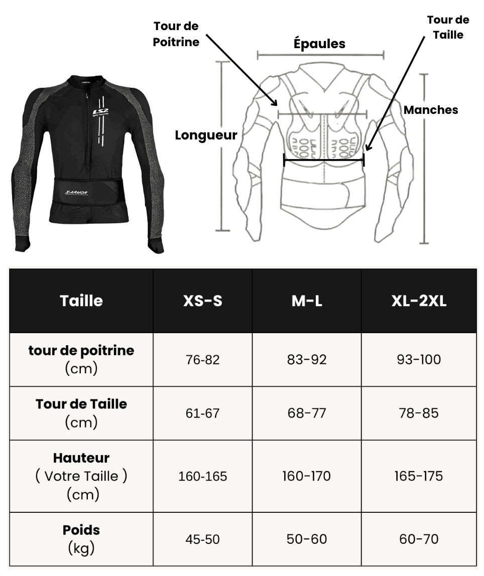 Comprend 2 protections pour épaules, 2 protections pour coudes, une protection pour la poitrine et une protection dorsale, toutes certifiées CE pour absorber efficacement les chocs.