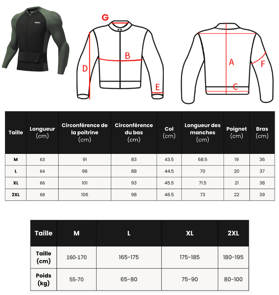 - Conseil : Si vos mesures se situent entre deux tailles, choisissez toujours la taille supérieure.