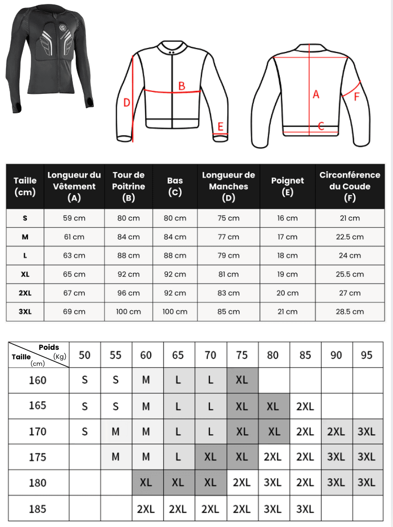 - Conseil : Si vos mesures se situent entre deux tailles, choisissez toujours la taille supérieure.