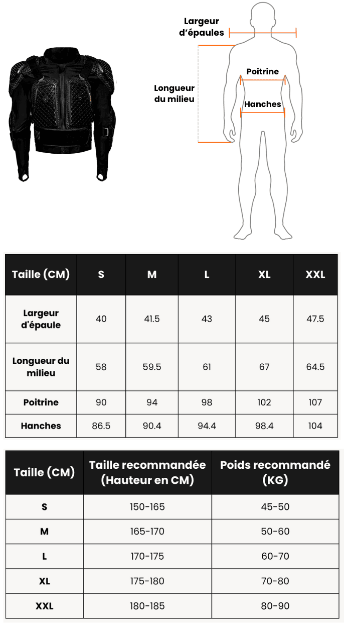 • Protections : Épaules, coudes, poitrine, dos, taille