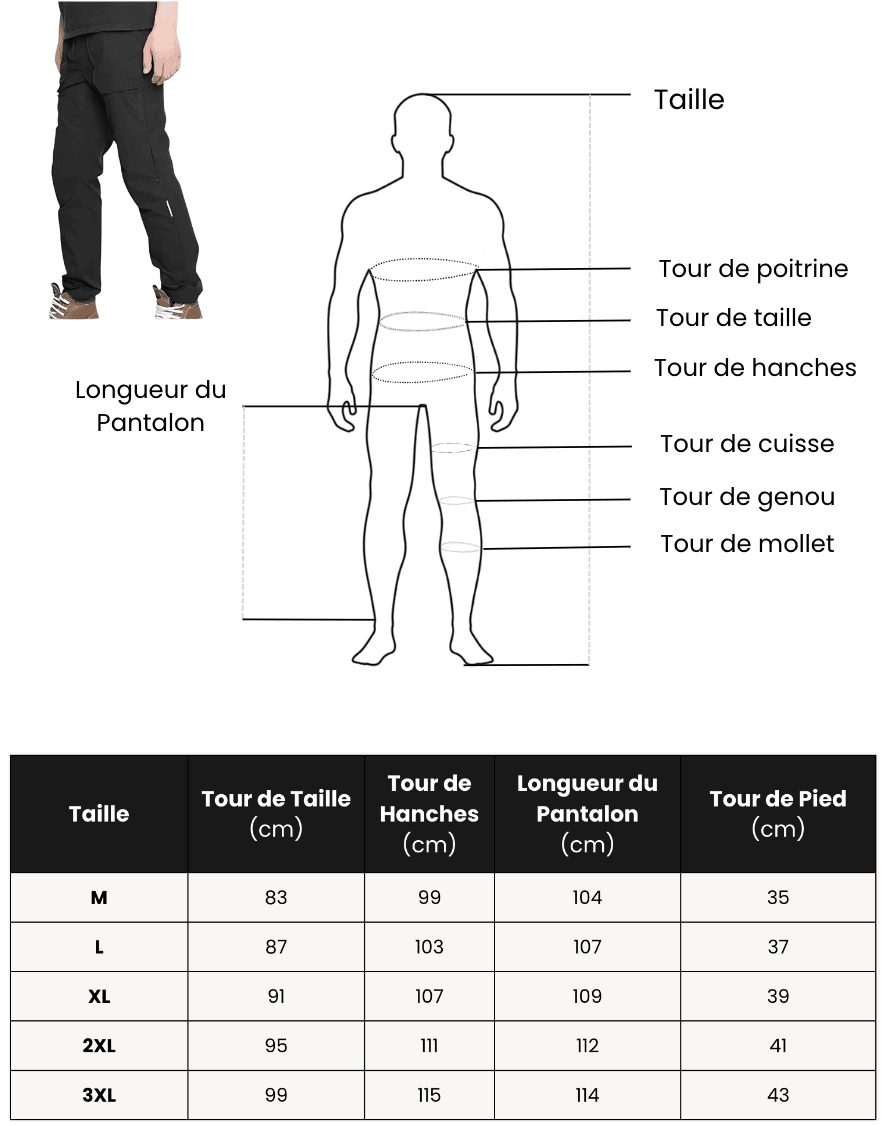 - Conseil : Si vos mesures se situent entre deux tailles, choisissez toujours la taille supérieure.