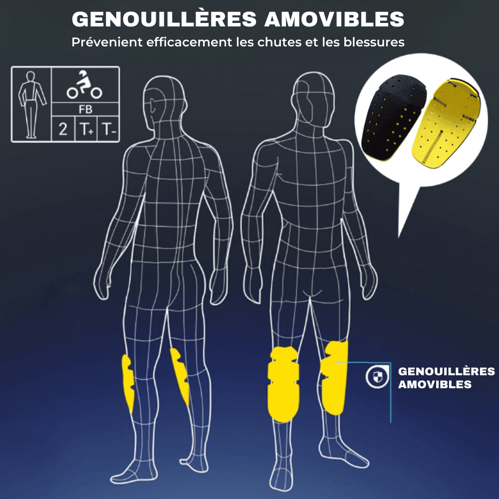 Genouillères CE intégrées, flexibles et invisibles, ajustables pour un confort personnalisé.