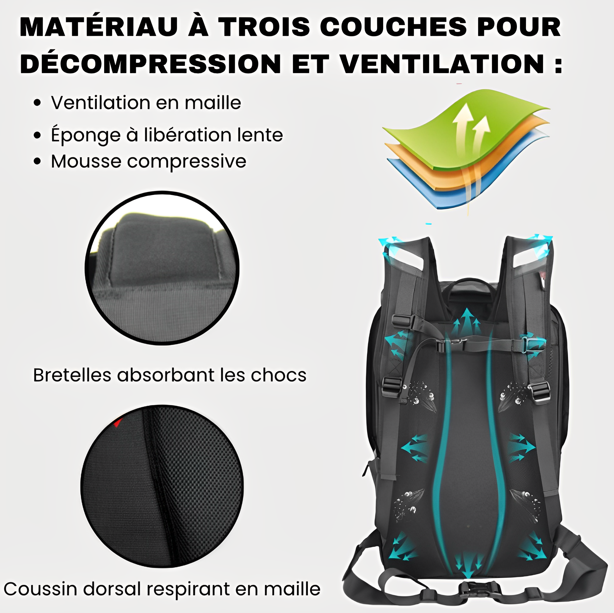 Profitez d'une conduite plus confortable avec la conception à trois couches de notre sac. La couche en maille assure une ventilation optimale, tandis que l'éponge à libération lente et la mousse compressive offrent un confort et une absorption des chocs supérieurs. Les bandes réfléchissantes et le zip étanche garantissent votre sécurité et une protection contre l'humidité pendant vos trajets nocturnes.